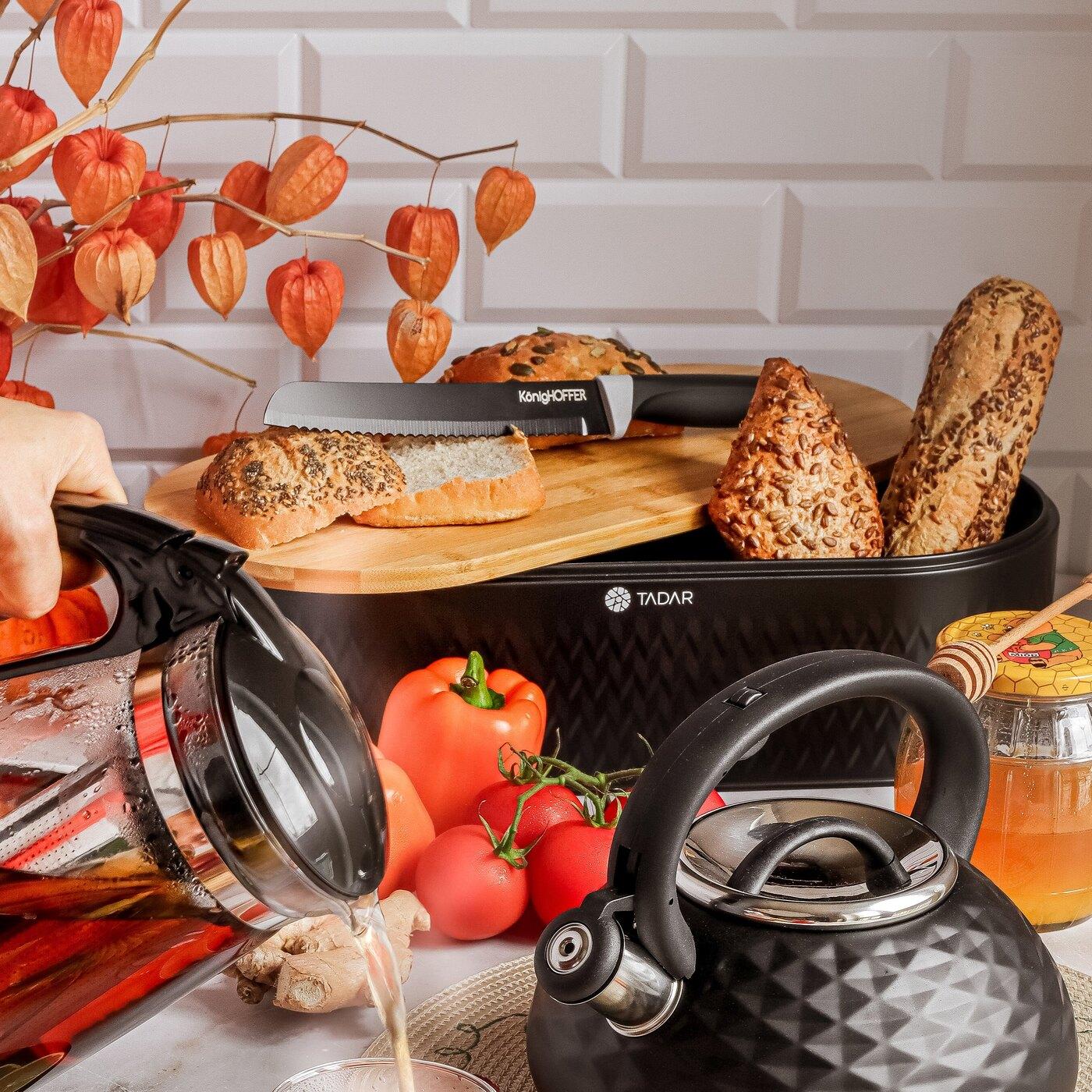 Z chlebakiem Tadar Iconic 44 x 21 x 12,5 cm kuchnia wypełni się aromatem pieczywa, który rozbudzi apetyt twoich bliskich. W elegancki sposób przełamiesz monotonię wystroju kuchni oraz śniadań. W tej regularnej bryle ze stali węglowej kryje się bowiem chrupkość i świeżość.